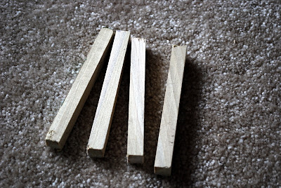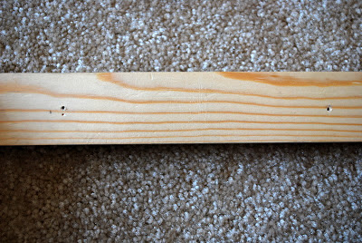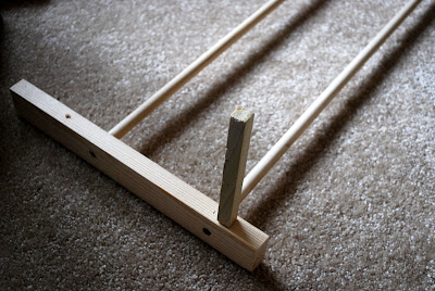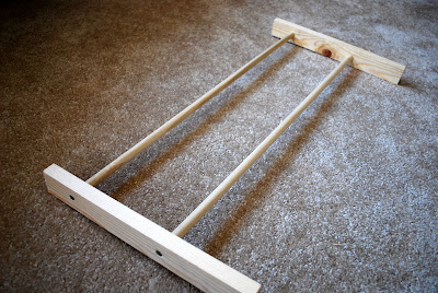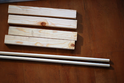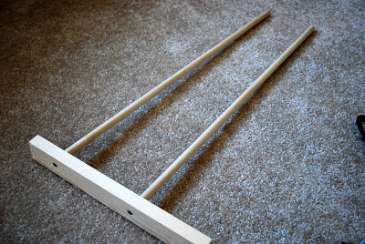 We went to Lowe's for the wood. They will cut pieces of wood for you for free, which is very helpful since I don't have access to all my dad's saws and tools anymore.I bought two 1/2" dowels that were 48" long and had someone cut them right in half at 24".