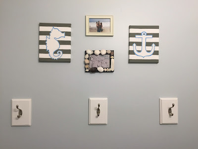 I made the two striped canvas pictures (the seahorse and the anchor), if you want to check out the tutorial for those, you can find them here: DIY Beach Themed Canvas Art