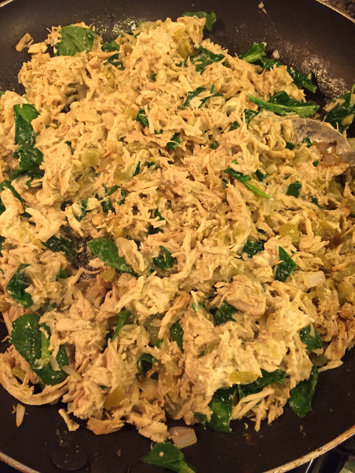 In the same skillet you cooked the chicken in, over medium heat add butter, onion, green chilies, cream cheese, salt, pepper, cumin, spinach, and shredded chicken. Cook and stir until it is all incorporated together.