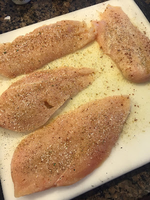 I start out with 2 boneless, skinless chicken breasts and filet and season them.