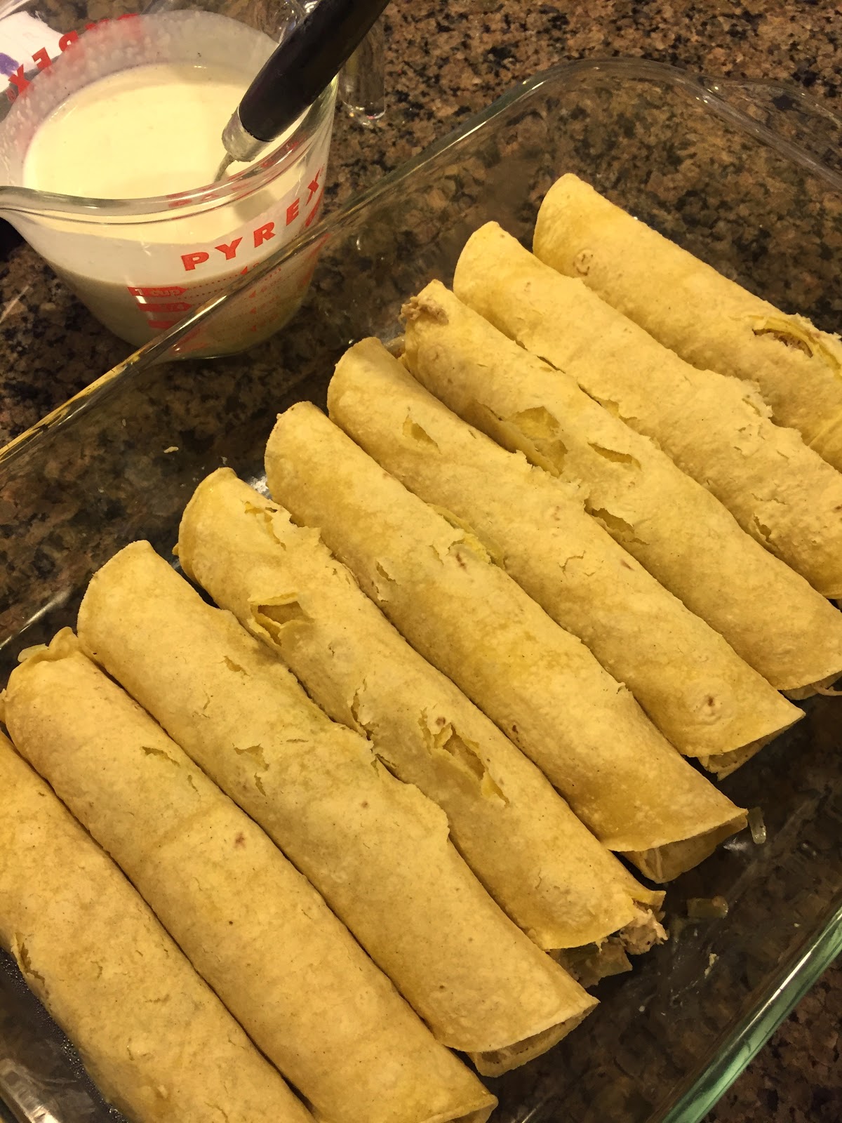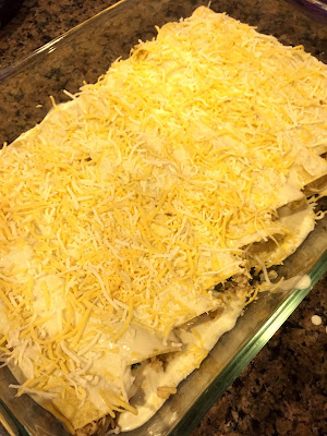 Place filled tortillas close together in a 9x13 baking dish. Mix together the heavy cream and green enchilada sauce and drizzle it over everything. Sprinkle with cheese and bake uncovered for about 15-20 minutes.