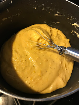 After you add the cheese it will start to pull away from the sides of the pan when you're stirring.After the noodles have cooked you'll drain the water and add them to the baking dish.