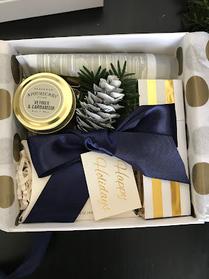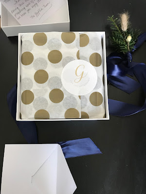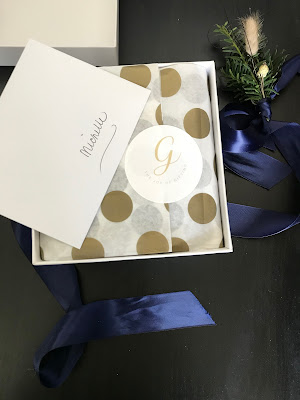 To start out with we have a crisp, clean white box with a blue satin ribbon adorned with beautiful, seasonal greenery.