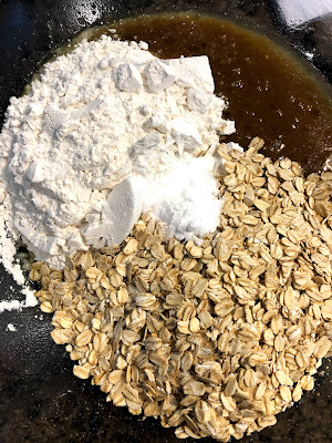 Once it's combined, add the flour, oats, and baking soda and stir it all together.