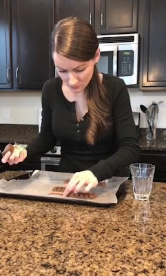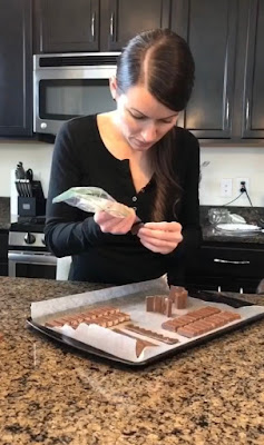 I cut the Kit Kats in half and used the melted chocolate to draw a long thin rectangle that was the same size/length of the Kit Kats I had laid out.